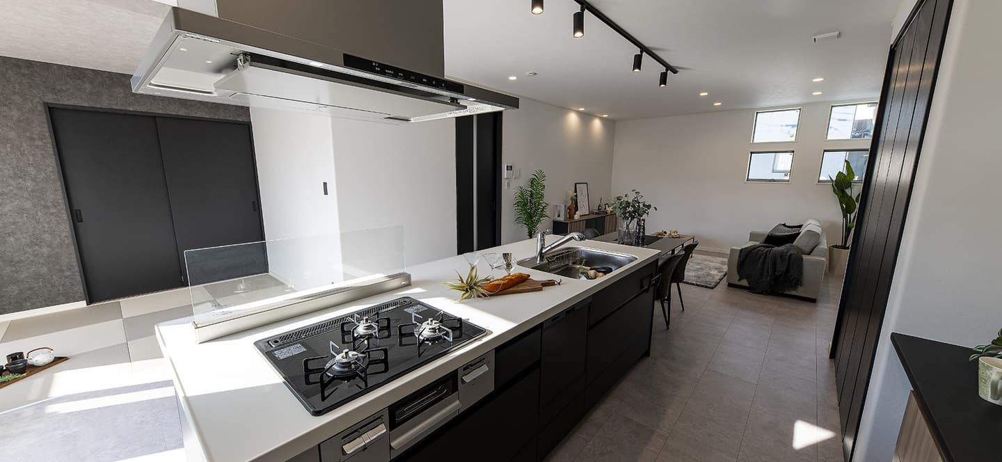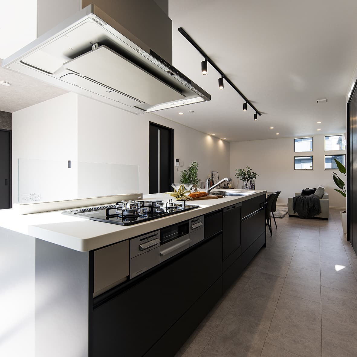 清潔感溢れる広々とした素敵なキッチンスペースは、「機能性」と「開放感」で、楽しい時間をもっと沢山。家族の顔を見ながら、大切な友人との会話を楽しみながら、食事の時間を愉しむ幸福。この家でならもっと大事な時間が積み重ねられる。