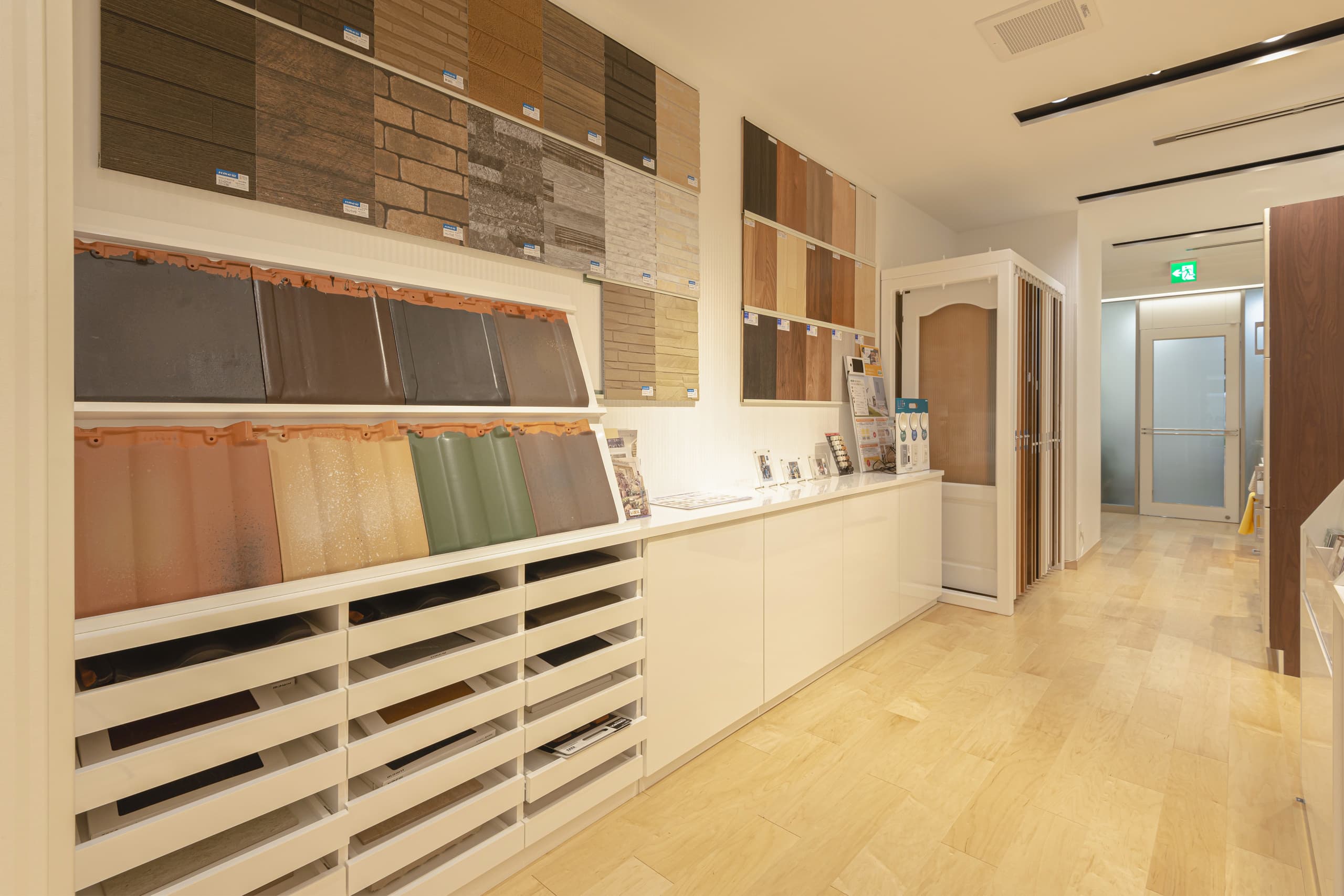 神戸支店のショールームは、ガラス張りのショールームで明るい光のもと、設備の使い勝手を試したり、外壁や屋根の色等も見比べられます。