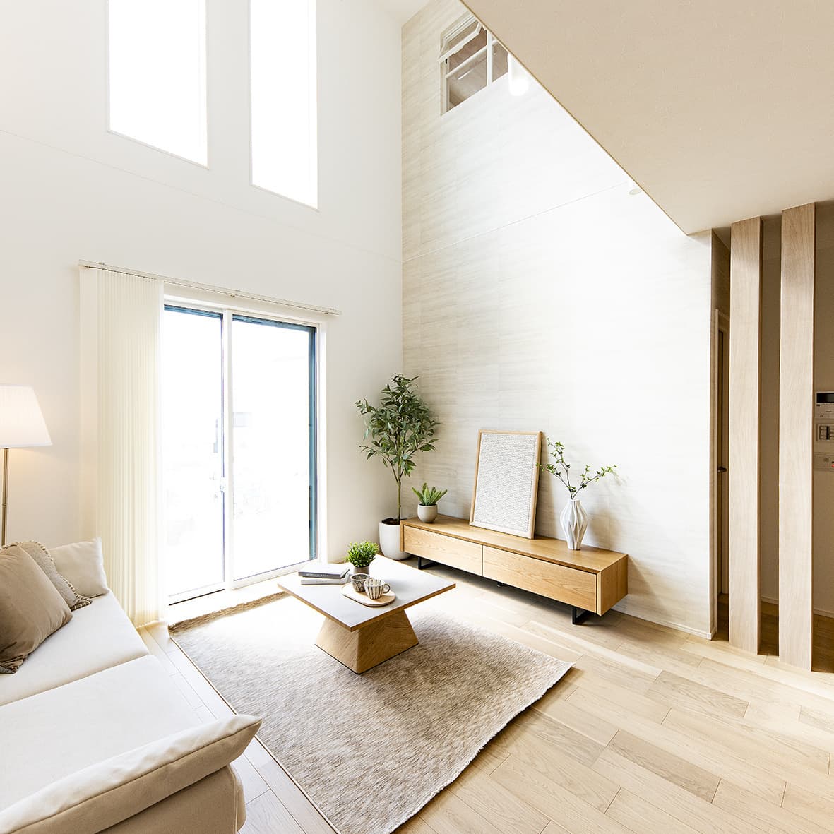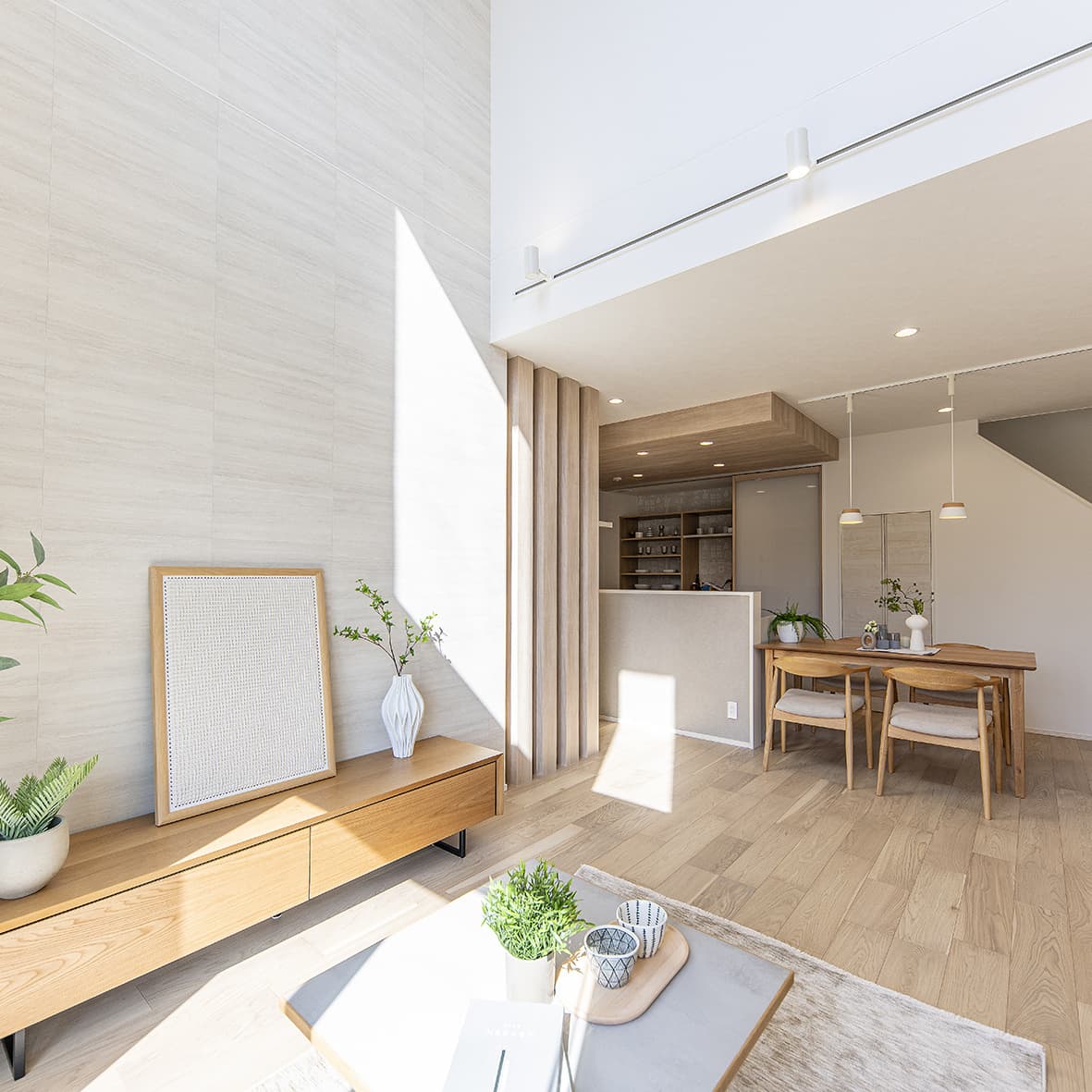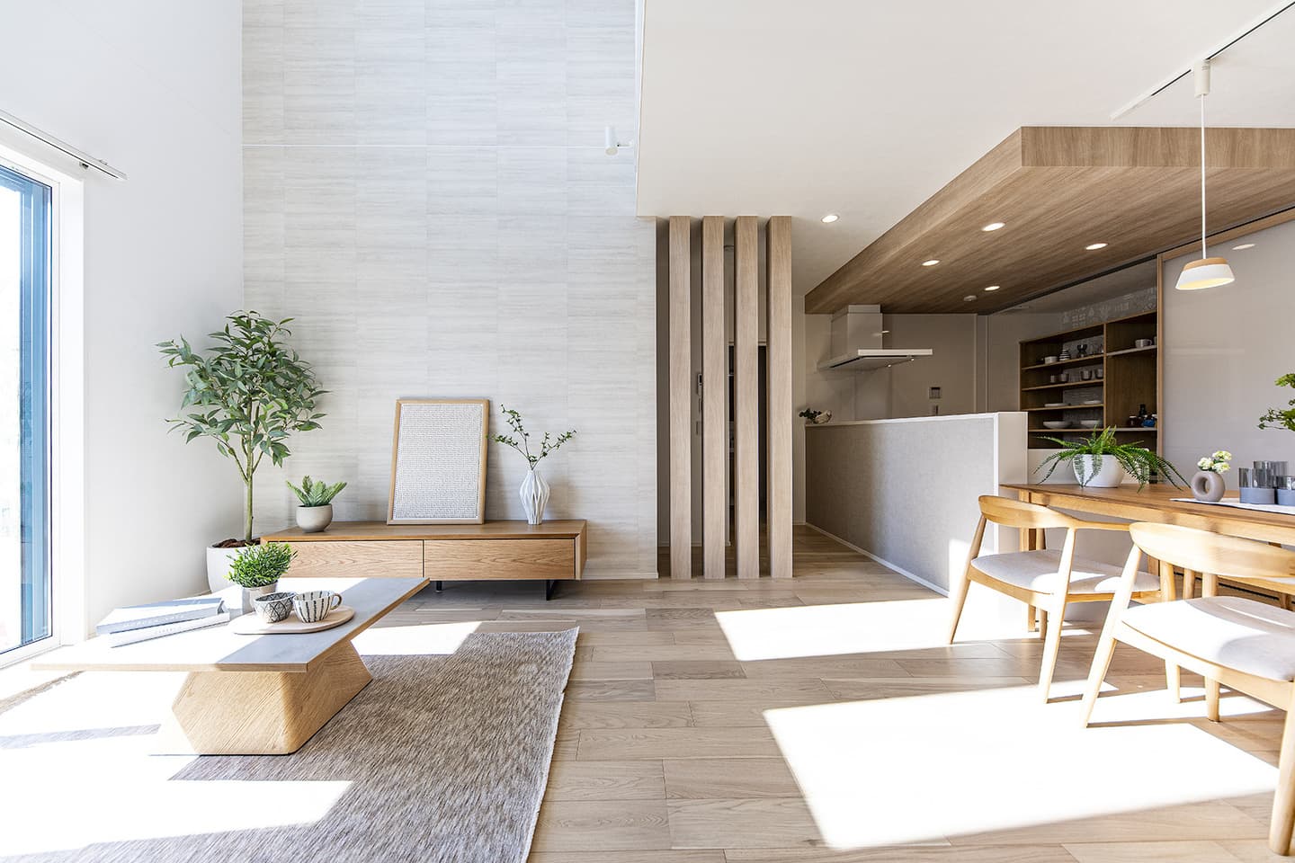 広々としたLDKに、ウッドデッキを通した光が差し込む。自然の光に包まれ、新鮮な空気がめぐる室内。家族のくらしが見渡せ、心を開放するのびやかな空間。動線をさえぎる柱や仕切りの少ないのびやかな空間は、日々の動きもスムーズ。家屋みんなの顔が見える、爽やかな暮らしを実現。